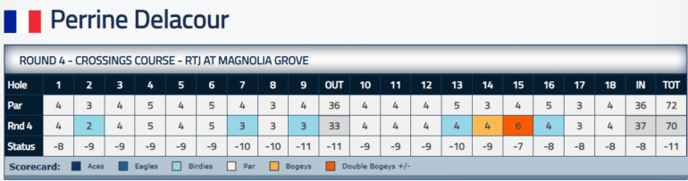 Dans le coup depuis le début de cette finale des Cartes pourtant fortement perturbée par une météo très capricieuse ayant obligé les organisateurs à réduire le format du tournoi à 72 trous (au lieu de 90) sans cut après quatre tours, Perrine Delacour grimpe sur le podium final à -11 (275) en compagnie notamment de l’Américaine Ryan O’Toole et des Chinoises Jin Yan et Mohan Du.