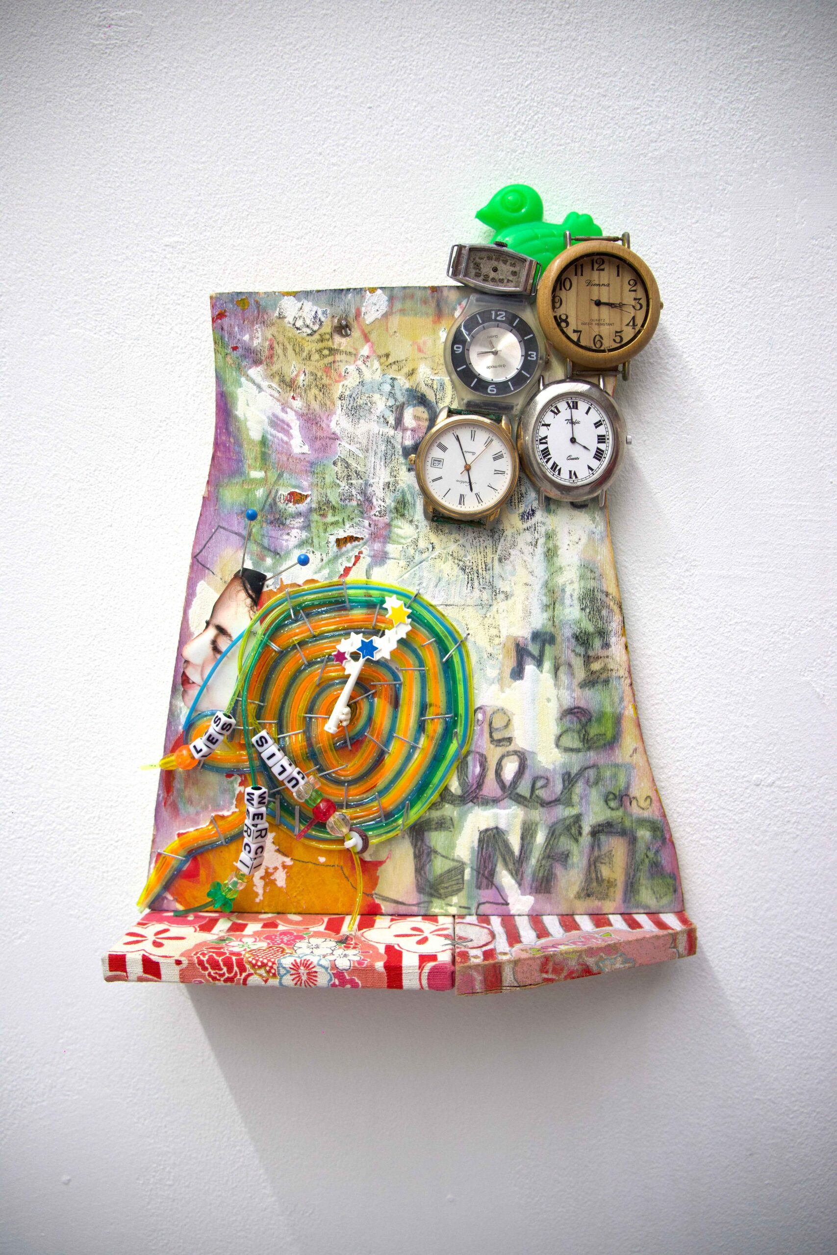 Myriam procède par collage et assemblage d’éléments récupérés en brocante ou en ressourcerie. Les médiums qu’elle utilise sont multiples, allant du bois, du papier jusqu’au textile. Myriam grâce à ses médiums expérimente les textures, les dimensions et les couleurs tout en parlant de soi. La mode fait partie intégrante de son univers artistique où là aussi la récupération et l’upcycling sont au centre de sa démarche. Cet art “cheap” et accessible est assumé et Myriam arrive à nous en montrer sa richesse. La saturation et les accidents sont justement un vecteur de création.