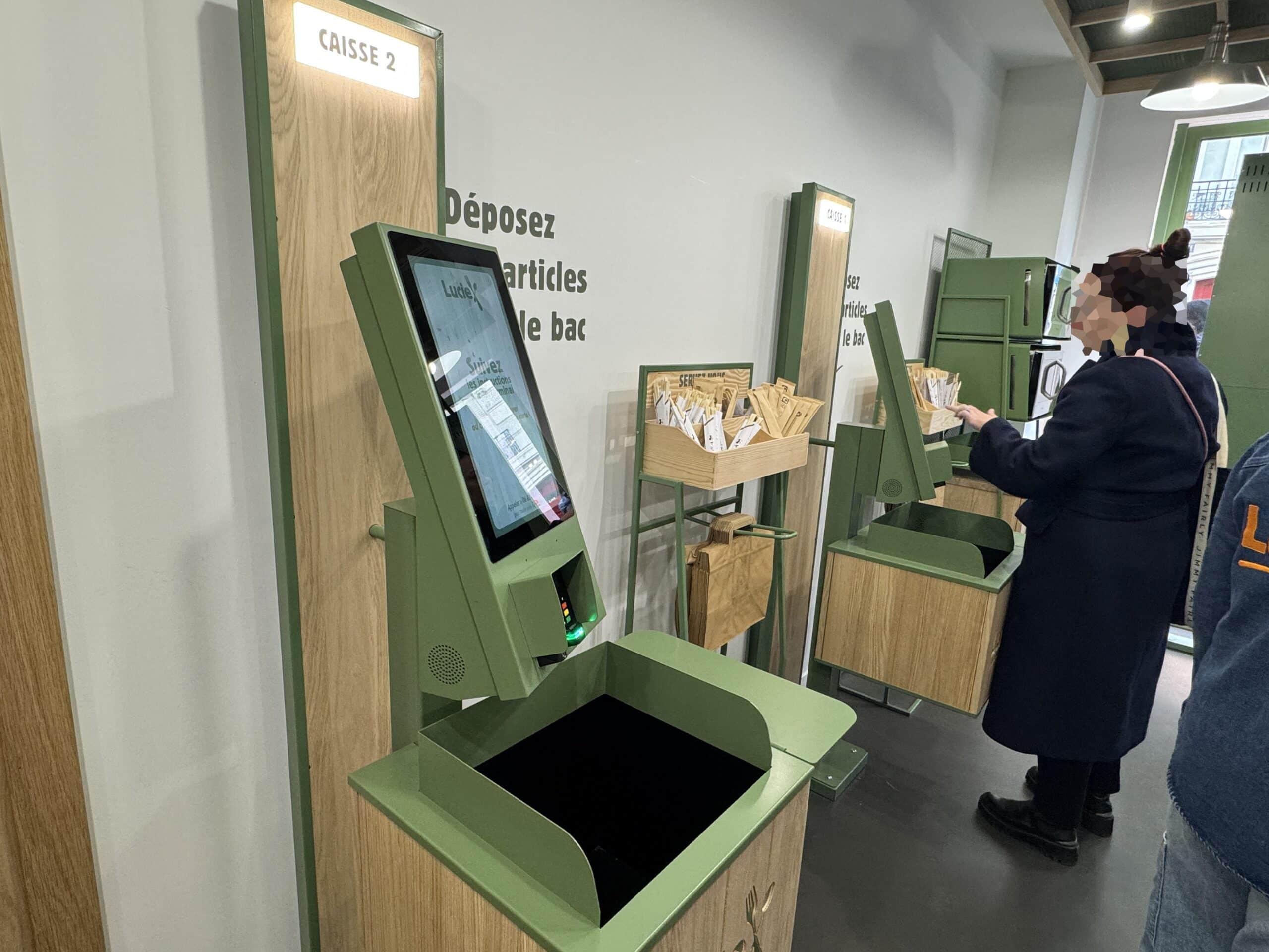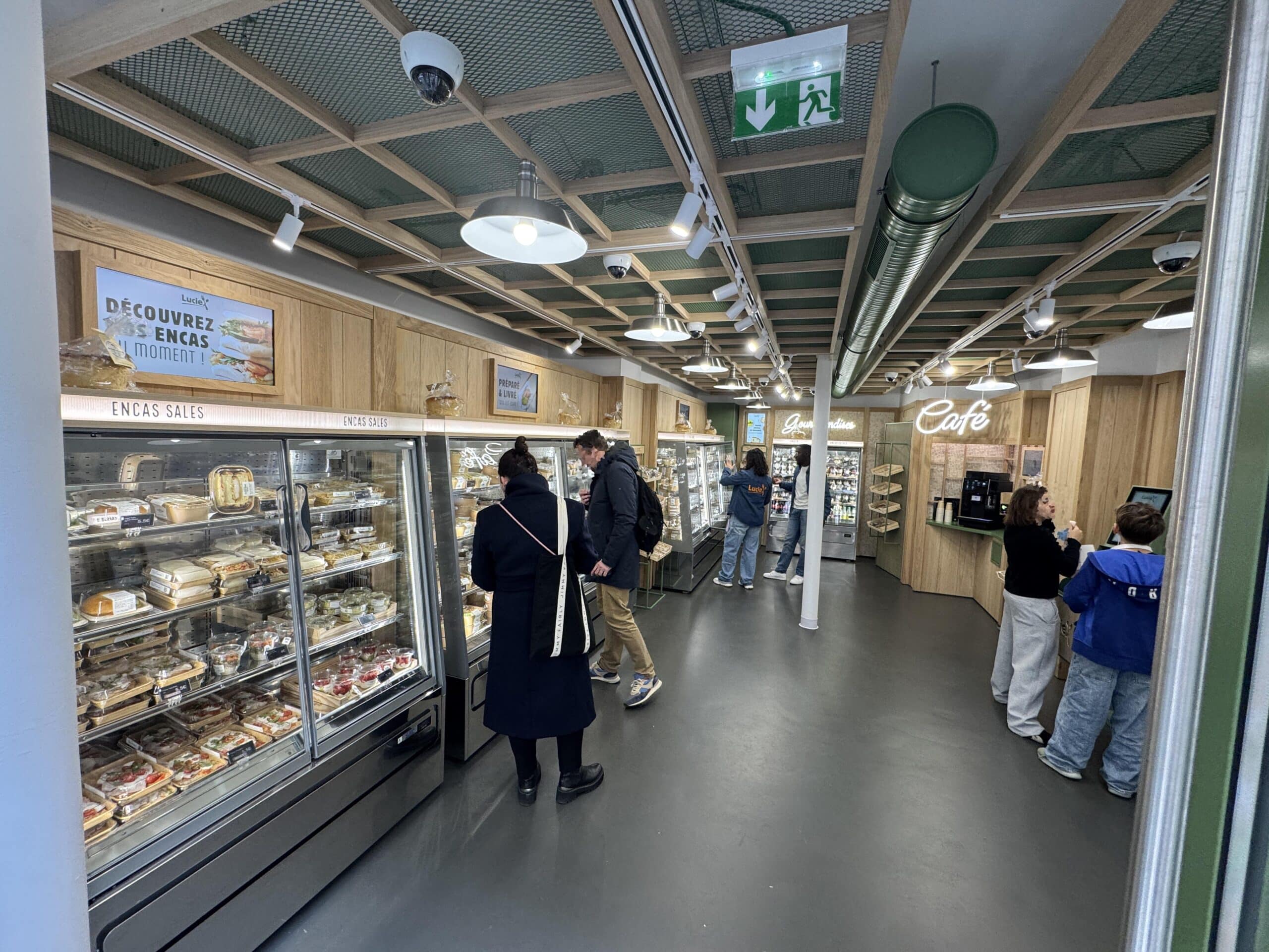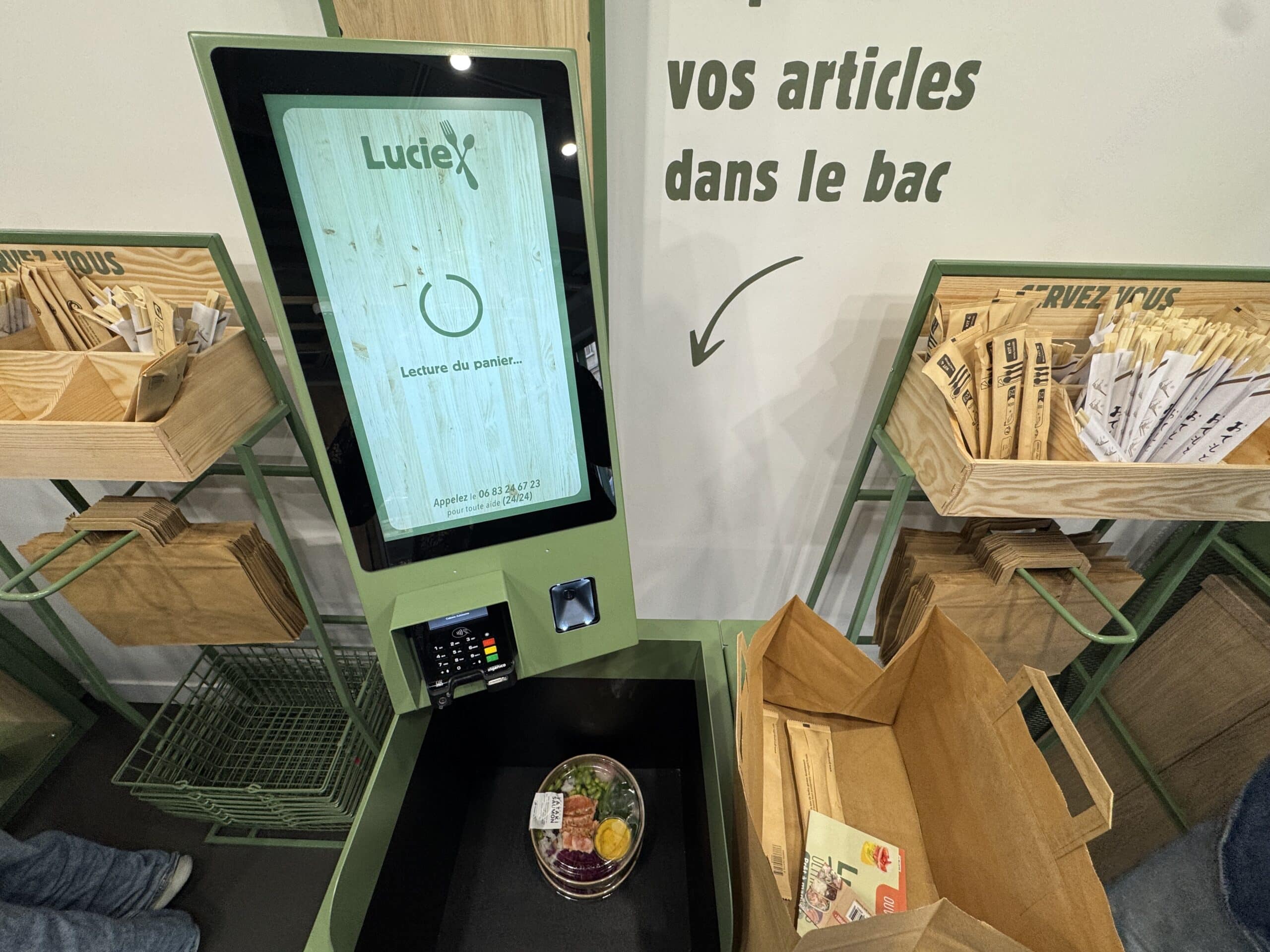 L’originalité réside donc dans le parcours client, autonome. Sur chaque produit : une puce RFID, qui permet un encaissement “façon Decathlon” sans avoir à lire scanner les articles (voir vidéo). En ce sens, Lucie peut fonctionner sans personnel (dans les faits, une part de l’amplitude horaire est couverte par un employé, notamment chargé du réassort). Hors plages horaires avec personnel, le client utilise sa carte bancaire pour pénétrer dans la boutique. Via les caméras et l’écran de la caisse, il peut aussi communiquer avec une “hot-line” gérée par l’enseigne. Pour l’heure, un quart du CA est réalisé la nuit.