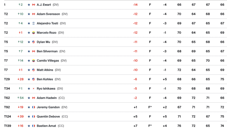 Deuxième, son compatriote Adam Svensson est un ex-habitué des fairways du PGA Tour puisqu’il s’y était même imposé, en 2022 lors du RSM Classic. Classé 162e à la FedEx Cup cette année, il avait perdu ses droits de jeu sur le PGA Tour pour la première fois depuis 2020. Il va donc continuer son histoire avec le plus grand circuit outre-atlantique.