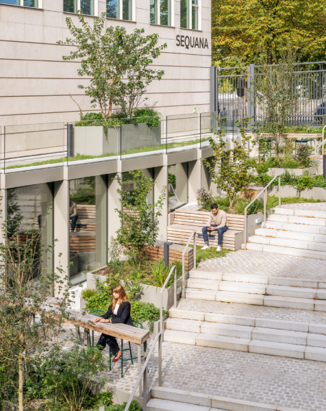 La réhabilitation lourde et la transformation du Sequana se définit par plusieurs interventions phares dont la création de la percée centrale plantée, l’accessibilité du rez-de-chaussée, du 4e, 6e, 8e étages ainsi que la toiture, qui sont devenus des lieux de travail extérieurs et de convivialité et finalement l’optimisation des conditions de travail à travers des plateaux ouverts, généreux, lumineux et fonctionnels.