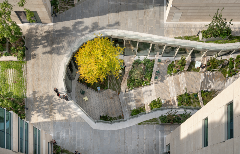 Dans cette intervention, le geste architectural a été d’une grande finesse. Dans le but de fusionner l’identité d’origine du bâtiment avec les besoins actuels, les architectes ont réussi à réconcilier la bâtisse à la ville en privilégiant les mobilités douces tout en dotant l’ensemble d’espaces extérieurs végétalisés.