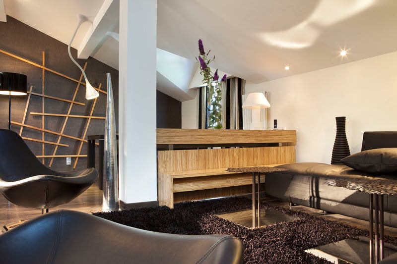passage, se distingue par un design sobre et contemporain : parquet brun foncé,