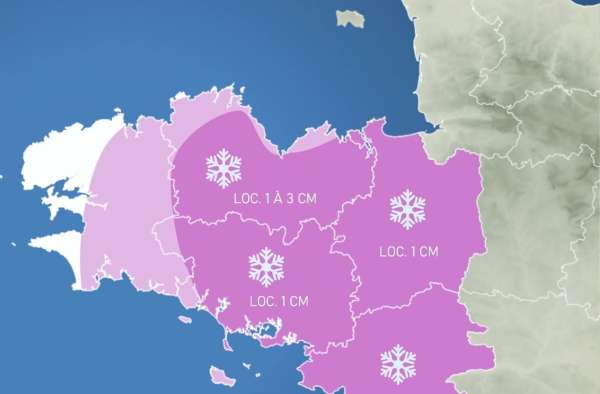 Dans la nuit, l’arrivée d’une goutte froide par l’est apporte de l’humidité dans une masse d’air déjà très froide. Les précipitations neigeuses devraient débuter vers 4 heures sur l’est de la Loire-Atlantique et de l’Ille-et-Vilaine, avant de s’étendre progressivement à l’ensemble de la Bretagne en fin de nuit et en matinée. Les secteurs côtiers les plus exposés au vent pourraient rester à l’écart des chutes de neige.
