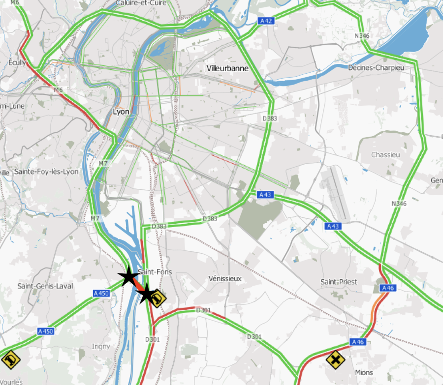 La portion concernée se situe entre les deux échangeurs A450-A7 et A7-périphérique dans les communes de Pierre-Bénite et Saint-Fons. Ces réparations imposent la coupure complète de la circulation de l’A7 à cet endroit dans le sens de Marseille vers Lyon.
