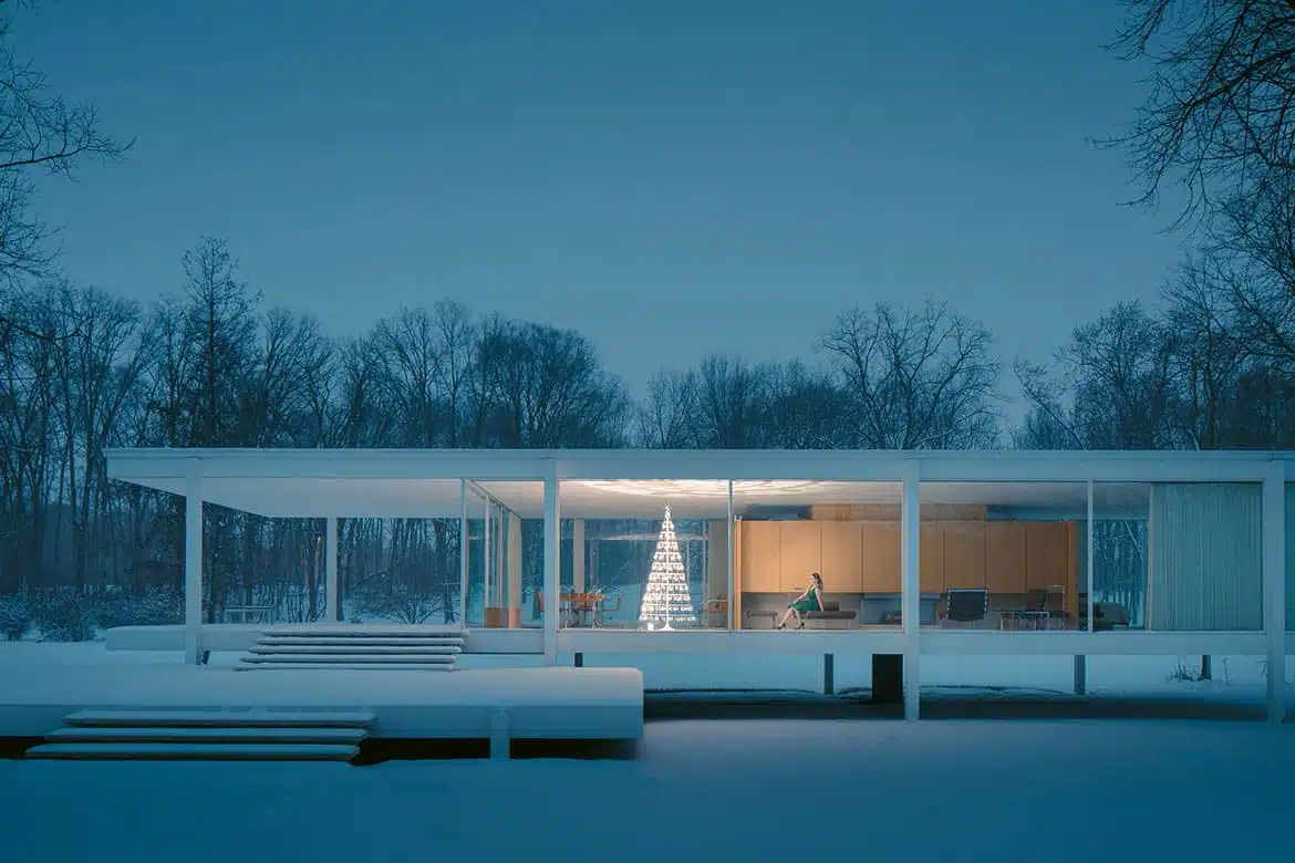 Un arbre de Noël moderne à la maison Farnsworth de Mies van der Rohe