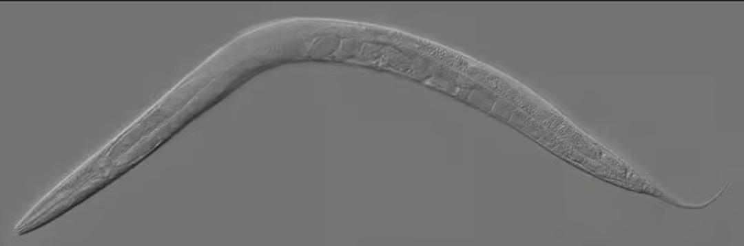 Le ver C. elegans est transparent, ce qui permet de visualiser facilement chacune de ses cellules. © Kbradnam, Wikimedia, CC by-sa 2.5