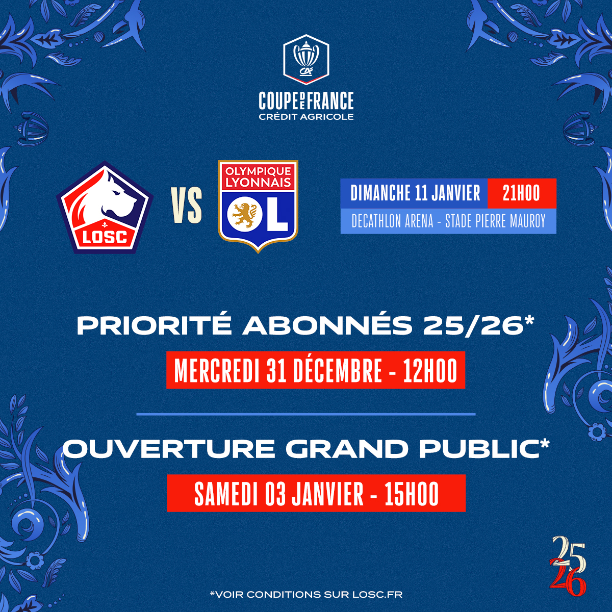 Comme pour chaque match à domicile, les abonnés 2025-2026 bénéficient d’une priorité d’accès à la billetterie. Pour ce rendez-vous en Coupe de France, le LOSC offre également à chaque abonné un tarif privilégié valable sur deux places (pour un panier limité à 10 places).