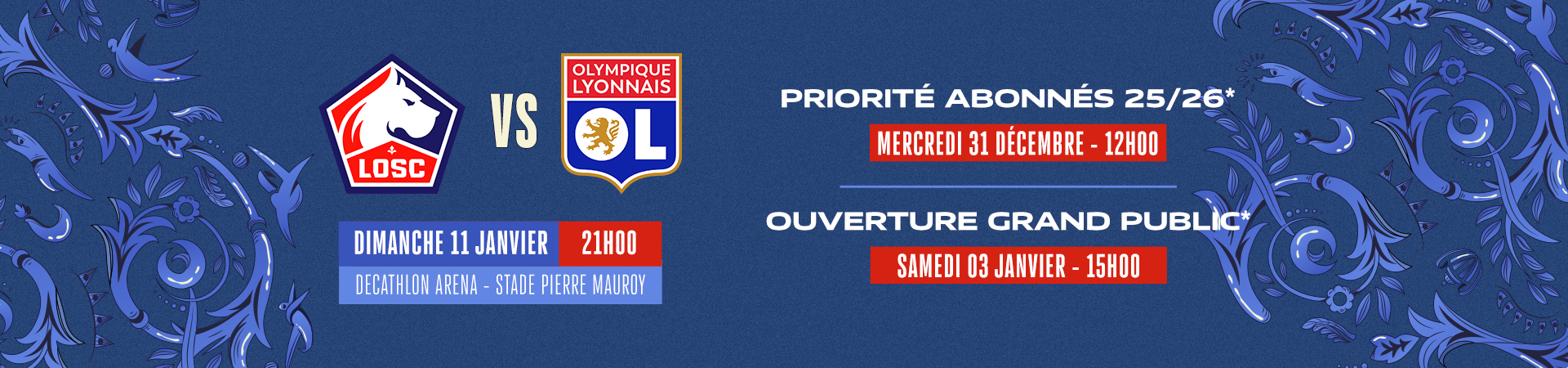 La billetterie pour LOSC-OL sera ouverte aux abonnés LOSC à partir de ce mercredi 31 décembre (midi) pour une durée d’exclusivité de 3 jours. Elle sera ensuite accessible pour tous à compter du samedi 3 janvier (15h).