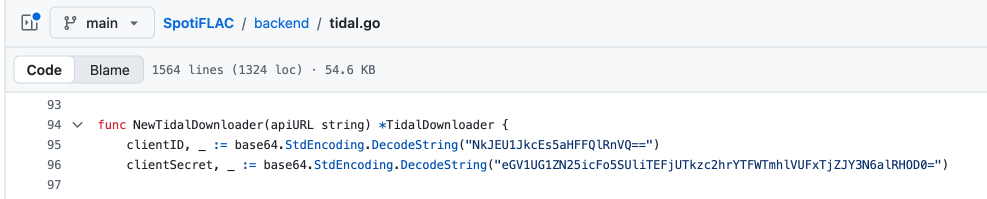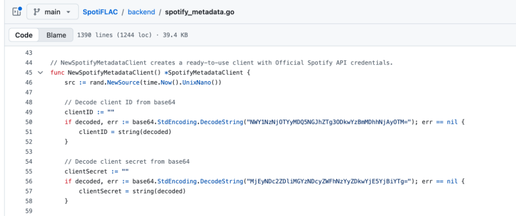 Déjà, premier constat, SpotiFLAC ne cracke rien du tout. L’outil ne contourne pas directement le DRM de Spotify (qui, rappelons-le, proposait uniquement de l’Ogg Vorbis jusqu’en septembre 2025). Ce qu’il fait, en fait, c’est qu’il utilise l’API Spotify via des identifiants placés directement dans le code (oups) pour récupérer les métadonnées des morceaux, notamment les codes ISRC (International Standard Recording Code) qui servent à identifier chaque enregistrement.