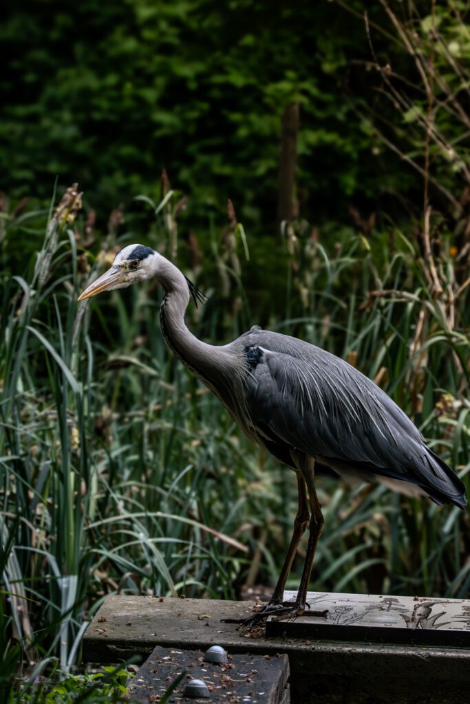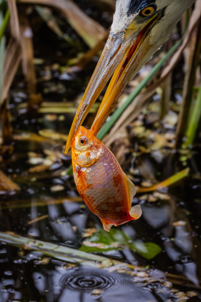 Héron cendré (jardin Pierre-Emmanuel). « Ce jardin a une petite mare où l’on voit parfois les poissons rouges proliférer. Et quand ça arrive, le héron cendré vient “faire sa tournée”. Il se pose, il observe, et il profite d’une chasse facile, presque mécanique, comme un régulateur naturel. La scène est impressionnante parce qu’elle a un côté documentaire, mais à l’échelle d’un jardin de quartier. Le gros plan met l’accent sur sa précision, sa patience, et sur cette réalité simple : la nature s’organise, même en pleine ville. »