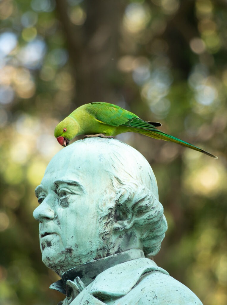 Perruche à collier (Père-Lachaise). « Elle s’est posée sur un buste ancien, et le contraste était parfait : patrimoine, pierre, mémoire, et un oiseau très contemporain de la ville. J’ai pris la photo pour cette collision élégante entre l’histoire du lieu et une nature urbaine qui se réinvente. Au Père-Lachaise, on a souvent l’impression d’un musée vivant. »