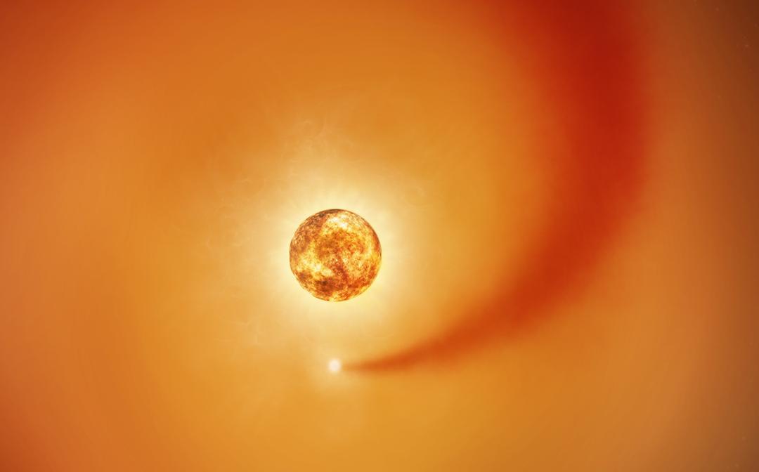 Cette illustration représente Bételgeuse, une supergéante rouge, et une étoile compagne en orbite. Cette dernière, qui tourne dans le sens horaire depuis ce point de vue, génère un dense sillage de gaz qui s’étend vers l’extérieur. Elle est si proche de Bételgeuse qu’elle traverse son atmosphère externe étendue. L’étoile compagne n’est pas à l’échelle ; elle serait minuscule comparée à Bételgeuse, des centaines de fois plus grande. La distance entre l’étoile compagne et Bételgeuse est, quant à elle, à l’échelle par rapport au diamètre de Bételgeuse. © Nasa, ESA, Elizabeth Wheatley (STScI); Science: Andrea Dupree (CfA)
