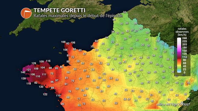 Les rafales associées au passage de la tempête Goretti seront très élevées. Les rafales devraient atteindre 150 km/h, localement 170 km/h sur les caps exposés sur le Cotentin et les côtes normandes. Dans les terres, les rafales devraient atteindre 100 à 120 km/h sur un large quart nord-ouest. Concernant la chronologie, la tempête devrait d’abord toucher les côtes bretonnes dès la fin d’après-midi, puis les côtes de la Manche dès 21h, et plus largement les côtes normandes et la côte d’Opale jusqu’à demain matin.