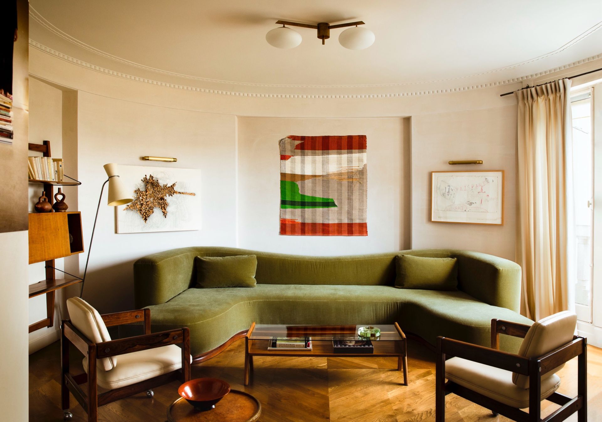 Dans le salon, canapé Gae en velours (coloris Virgin Island Salt) dessiné par Sandra Benhamou et, au-dessus, œuvre textile de Marie Hazard (The Journal Gallery). Table basse de Pierre Jeanneret. Paire de fauteuils de Sergio Rodrigues. À gauche, lampadaire de Pierre Guariche et tableau d’Amélie Chabannes. Au premier plan, guéridon tripode de Jean-Michel Frank (galerie Maxime Flatry) et coupe de Jean Dunand.