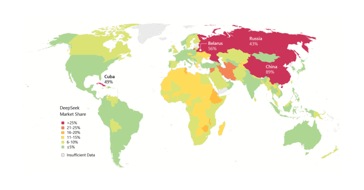 S’il a été massivement adopté en Chine, en Russie, en Iran, à Cuba et en Biélorussie, sans grande surprise, il profite également d’une popularité croissante en Afrique, souligne Microsoft, grâce à « une promotion stratégique et des partenariats avec des entreprises comme Huawei ». « Cette évolution rapide souligne une dimension de plus en plus importante de la compétition IA entre les États-Unis et la Chine, impliquant une course à la promotion de l’adoption de leurs modèles nationaux respectifs », complète la firme.