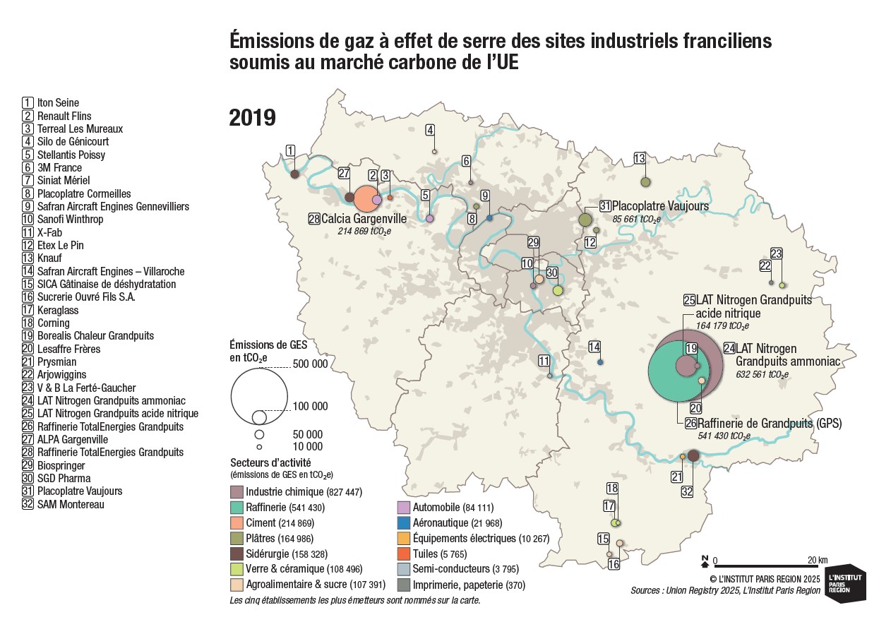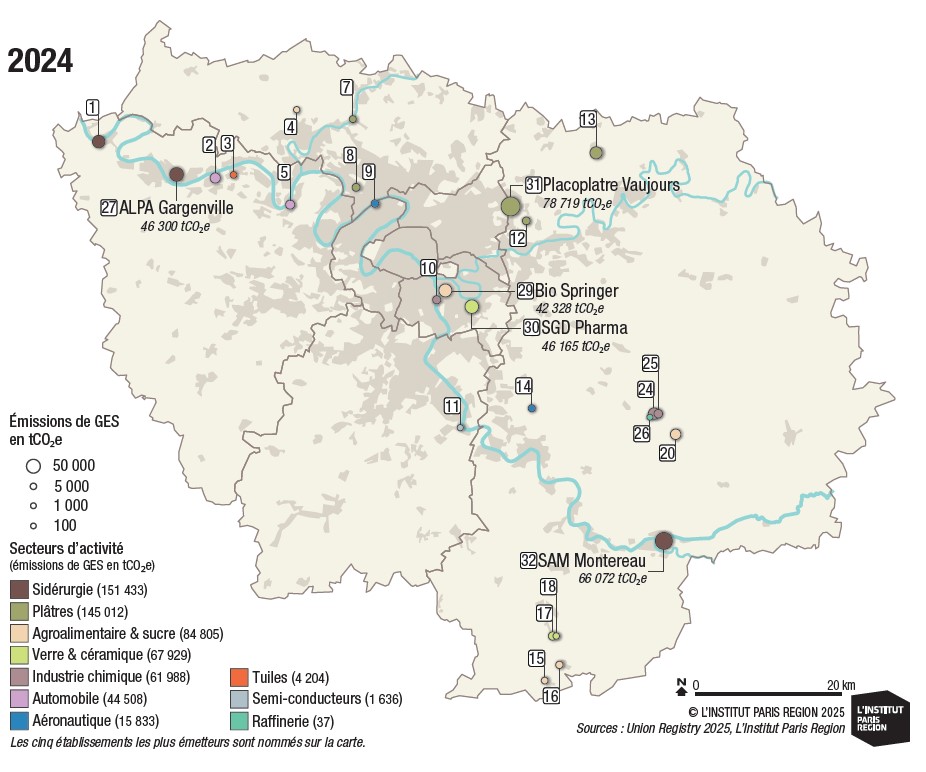 En 2024, l’Île-de-France comptait encore 25 sites industriels soumis au marché carbone européen6. Les émissions cumulées de ces 25 sites industriels franciliens les plus émetteurs ont totalisé 573 000 tCO2e, soit moins que ce qu’émettait à lui seul LAT Nitrogen Grandpuits en 20217. Malgré tout, ces 25 sites totalisent encore à eux seuls 44 % des émissions de GES de l’ensemble de l’industrie francilienne. Parvenir à concilier leur décarbonation avec le maintien de leur activité et de leur compétitivité est donc à la fois un enjeu crucial pour la pérennité de ces sites et un levier majeur à activer pour poursuivre la baisse des émissions de l’ensemble de l’industrie francilienne.