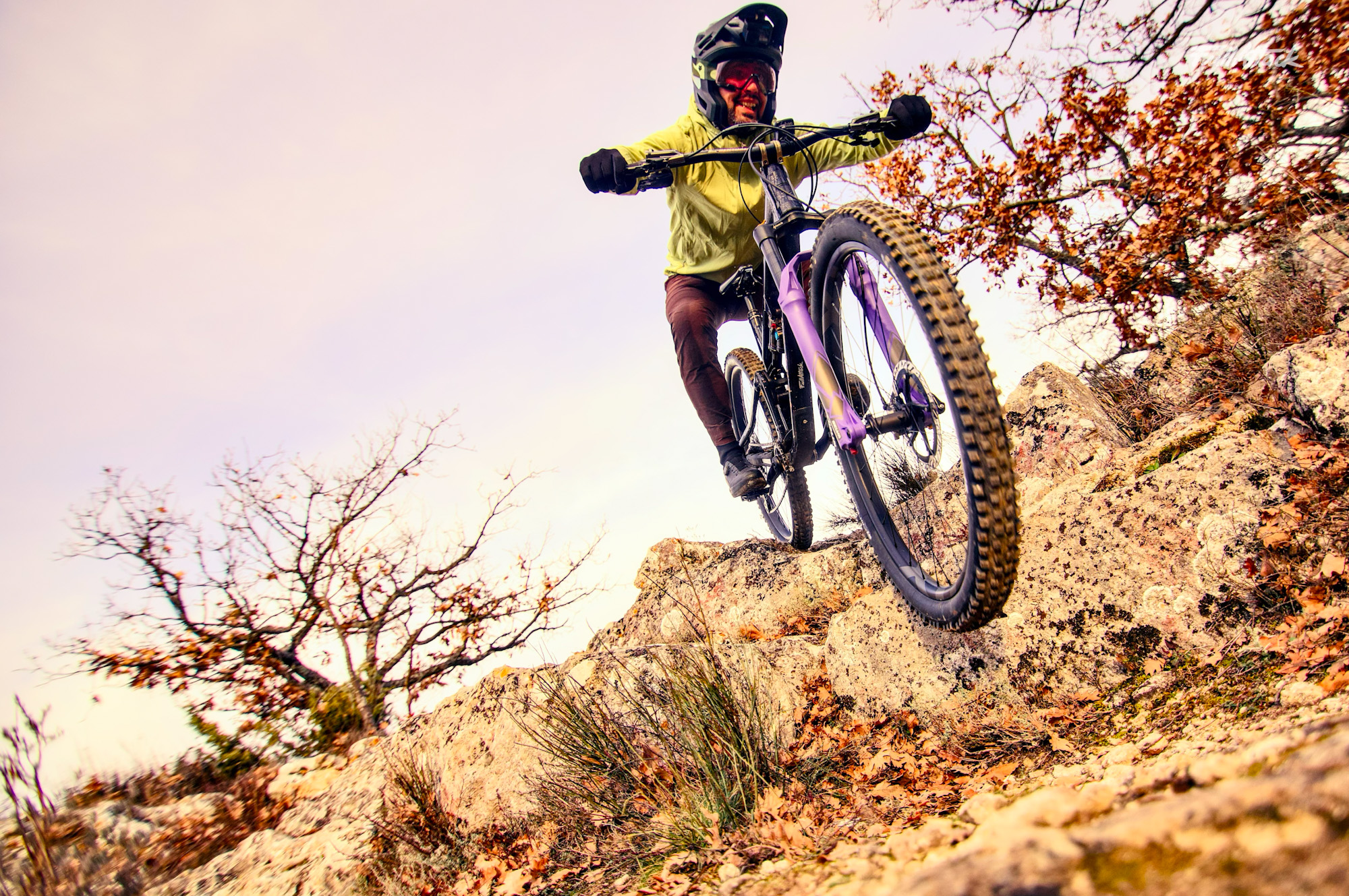 Dès les premiers tours de roue, le changement apporté par le nouveau châssis de la Formula Selva V saute aux yeux, ou plutôt aux mains. Si, sur le papier, tout ça ne semble pas être des évolutions spectaculaires, en pratique, la différence est palpable, et immédiatement quand on compare back-to-back avec la Silva JB. Sur des portions techniques où la direction doit être vive et précise, comme dans des enchaînements de virages serrés ou sur des sections scabreuses qui demande de serpenter en guise de meilleure option, la Selva V réagit de manière plus directe et précise. Ce n’est d’ailleurs pas juste une question de rigidité supplémentaire, mais plutôt de réactivité et de contrôle dans chaque mouvement du guidon. Les trajectoires, même les plus subtiles, y gagnent le zeste de précision et de vivacité pour passer un step. Ce gain est d’autant plus appréciable qu’il se traduit aussi quand il faut charger le train avant. Sans délai, ni dérive, la roue avant prend sa trajectoire et s’y tient davantage qu’avec la Selva JB et consœurs qui peuvent s’en écarter un peu plus.