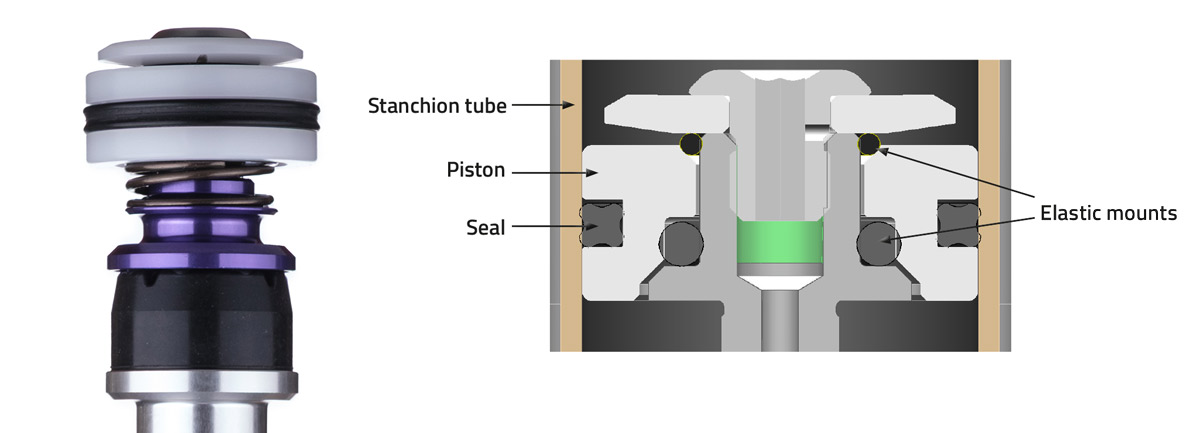 Mais ce nouveau ressort pneumatique ne s’arrête pas là. Son piston principal aussi, vaut le coup d’œil. Jusqu’ici monté sur rotule pour offrir un degré de liberté favorable à la sensibilité de l’ensemble, le nouveau piston qu’exploite la Formula Selva V se place cette fois-ci sur un support – (joint) élastique. L’intention est la même, la réalisation différence, et la vue de coupe de l’animation vu précédemment peut expliquer les raisons d’encombrement que cette solution peut permettre de solutionner.