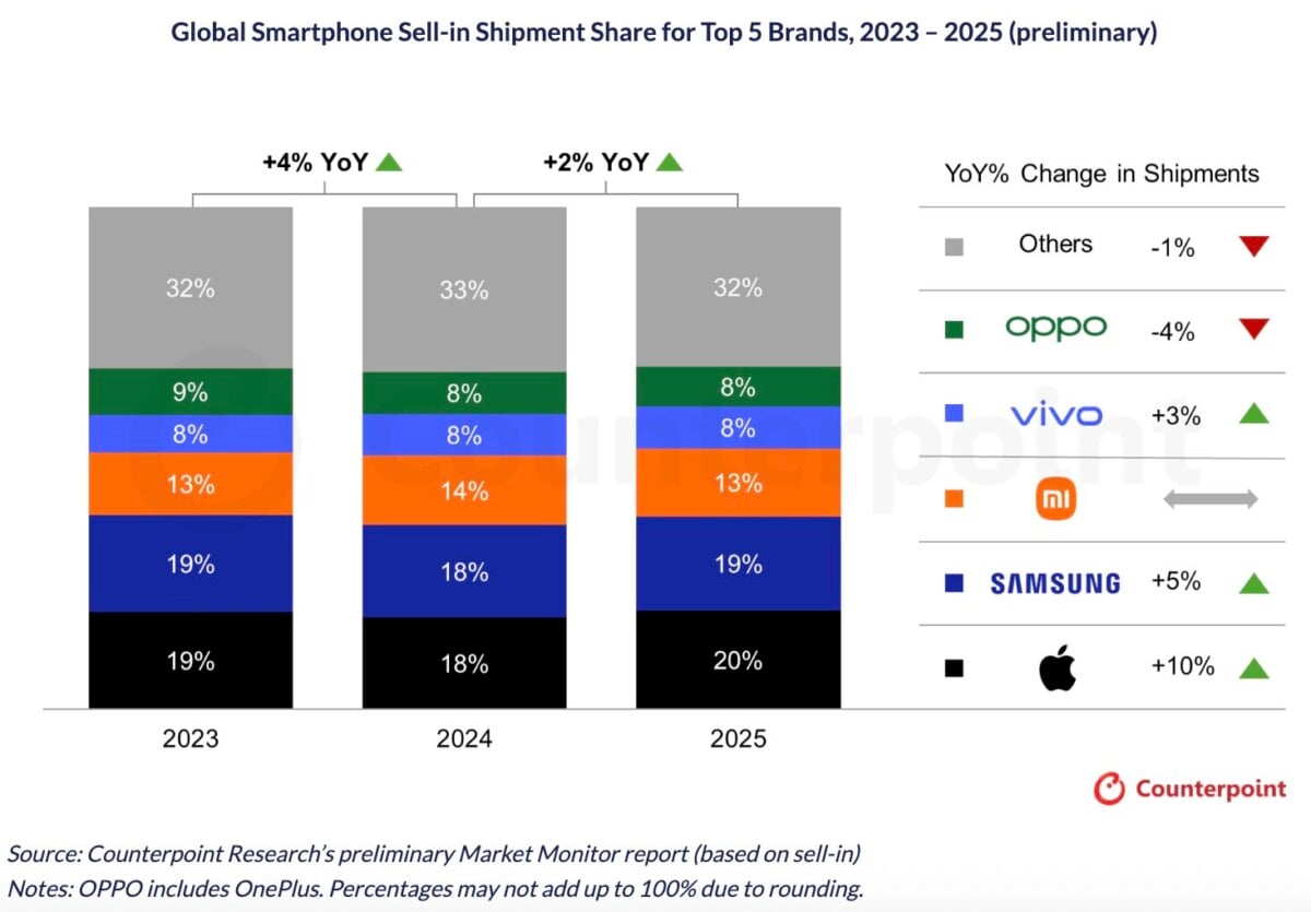 Le marché mondial du smartphone a repris des couleurs avec une croissance de 2 % en 2025, mais ce sont surtout deux géants qui tirent la couverture à eux. Si Samsung affiche une progression honorable de 5 %, Apple explose littéralement les compteurs avec une hausse de 10 % de ses expéditions.