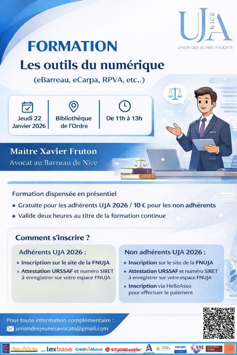 L’Union des Jeunes Avocats de Nice organise une nouvelle formation dédiée aux outils numériques indispensables à la pratique quotidienne de l’avocat. Intitulée « Les outils du numérique (eBarreau, eCarpa, RPVA, etc.) », cette session se tiendra le jeudi 22 janvier 2026, de 11h à 13h, à la Bibliothèque de l’Ordre.