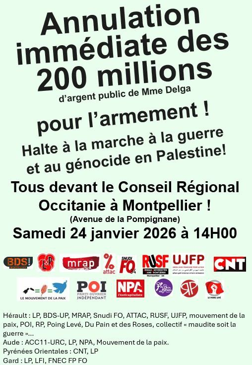 Après avoir publié et relayé une pétition demandant l’annulation de cette décision, plusieurs associations et organisations de l’Hérault, du Gard, de l’Aude et des Pyrénées-Orientales appellent à un rassemblement le samedi 24 janvier à 14 heures devant l’hôtel de Région à Montpellier pour dénoncer cette “marche à la guerre”.