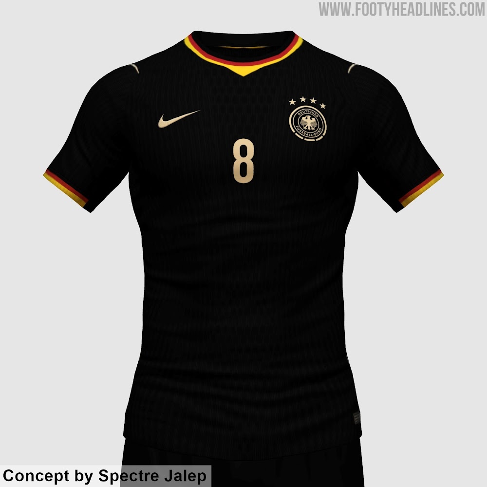 - Maillot extérieur: Le concept Nike Allemagne pour le maillot extérieur combine une base noire avec des logos dorés et le drapeau tricolore allemand sur le col et les poignets.