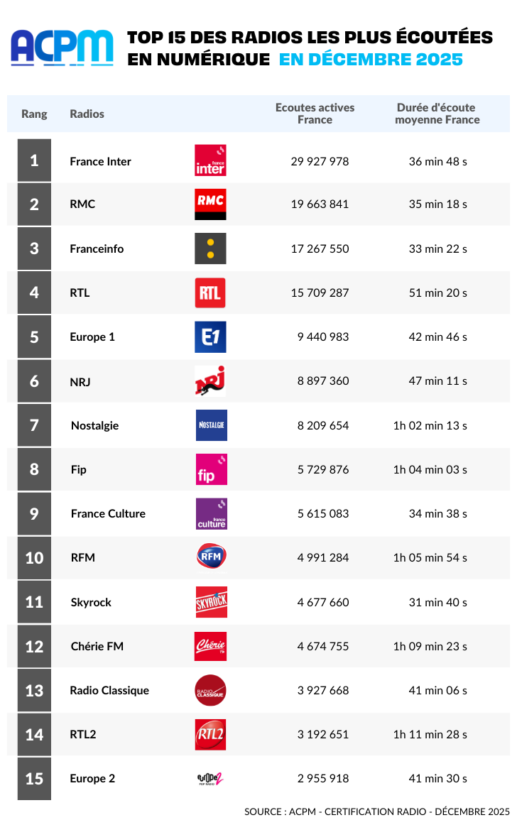 L’ACPM publie les chiffres de diffusion numérique des radios pour décembre 2025. France Inter survole le classement comme les mois précédents.
