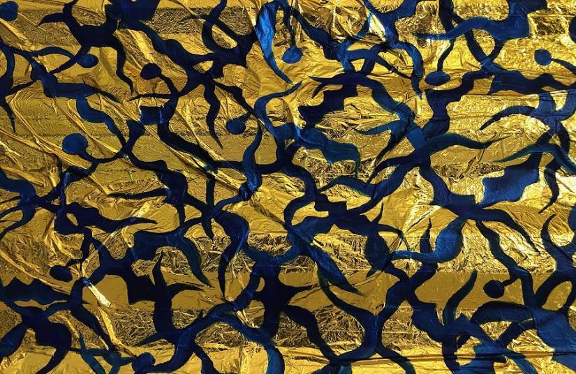 Louisa MARAJO – détail Grille de sargasses. Peinture sur couverture de survie-taille réduite ©Louisa MARAJO, dr