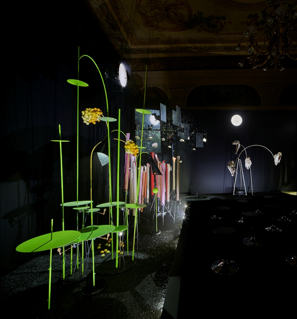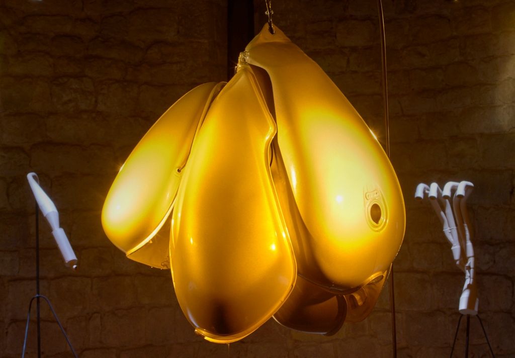 L’image n’est pas soumise à interprétation. Au centre de l’installation trônent, suspendus, des réservoirs jaune d’or rassemblés en grappe pour évoquer des testicules. De cette composition qui fleure la testostérone, s’écoule par gouttes une eau d’un noir profond, elle-même récupérée dans une bouée en plastique. Le pétrole est omniprésent à la vue, jusque dans les pièces mécaniques couleur chair qui entourent l’élément central. De là, des bruits de moteur imités par la voix humaine se font entendre, bientôt transformés en chant religieux du XVIe siècle. Mais si la foi est intacte, c’est le visage de Dieu qui a changé, désormais marqué par l’industrie automobile et pétrolière.