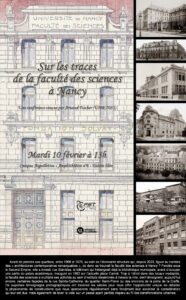 Le résumé de ce programme est le suivant : « Avant de prendre ses quartiers, entre 1966 et 1975, au sein de l’étonnante structure qui, depuis 2023, figure au nombre des « architectures contemporaines remarquables », où donc se trouvait la faculté des sciences à Nancy ? Fondée sous le Second Empire, elle a investi, rue Stanislas, le bâtiment qui hébergeait déjà la bibliothèque municipale, avant d’occuper une partie du palais académique, inauguré en 1862 sur l’actuelle place Carnot. Trop à l’étroit dans des locaux inadaptés, la faculté des sciences a multiplié ses activités au sein d’instituts disséminés à travers la ville, dont témoignent, aujourd’hui encore, certaines façades de la rue Sainte-Catherine, du quartier Saint-Pierre ou des environs de la porte de la Craffe. De superbes témoignages photographiques ont traversé les siècles pour nous offrir l’opportunité unique de détailler la physionomie de constructions que nous apercevons régulièrement sans forcément leur accorder la considération qui leur est due, mais également de lever le voile sur un passé ayant parfois disparu au fil des transformations urbaines ».