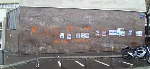 Mardi matin, plusieurs tags hostiles au président russe ont été découverts sur la façade de la galerie ainsi que sur des murs et immeubles situés à proximité immédiate. Sur les vitrines et les murs alentour, des inscriptions peintes à la bombe orange visaient explicitement le chef de l’État russe et la Russie, avec des messages tels que « Fuck Putin and all russians», « Death to Putin » ou encore « Poutine assassin ».