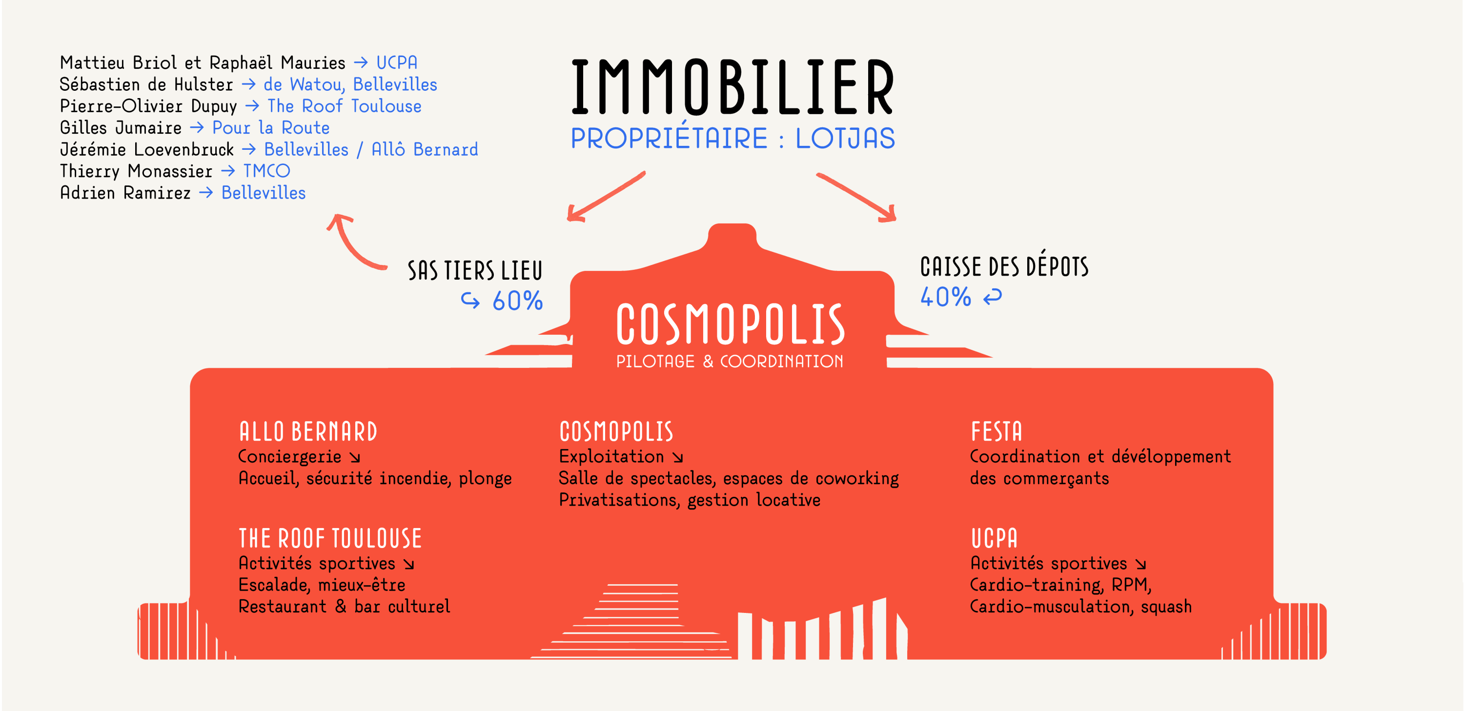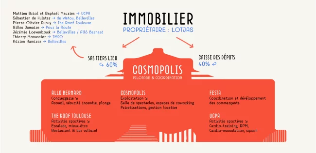 Sur les photos : Jérémie Loevenbruck, associé fondateur des Halles de la Cartoucherie, la directrice générale des Halles de la Cartoucherie, Muriel Le Vaillant, et Jean-François Renac, le dirigeant de Miharu. Crédit : M.V-ToulÉco. Ci-dessous : Schéma qui explique la structuration des Halles de la Cartoucherie. Crédit : Halles de la Cartoucherie.