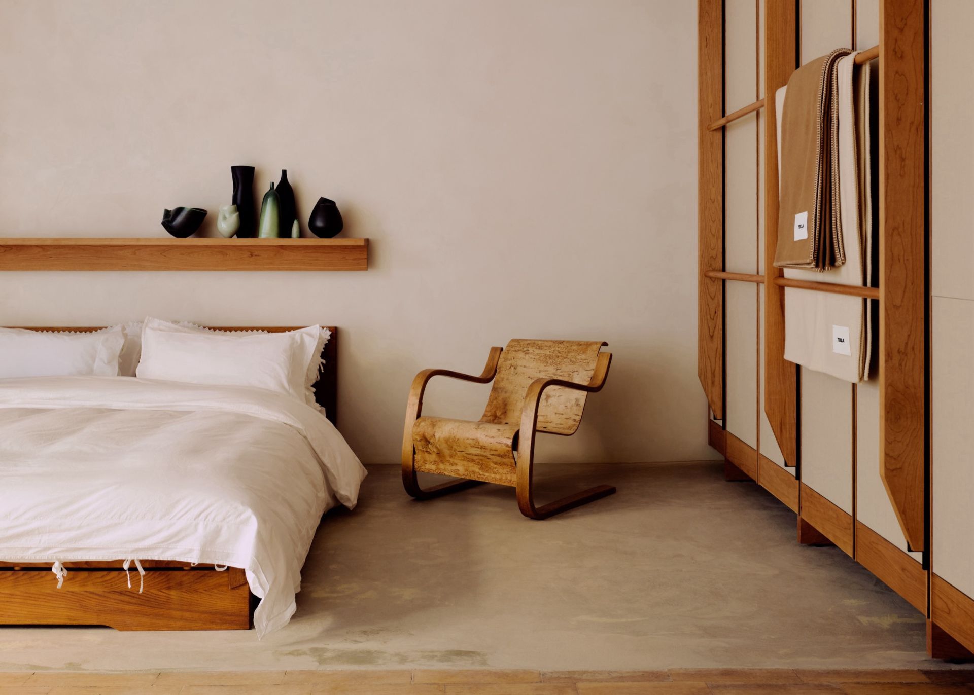 Passé maître dans l’art de magnifier nos intérieurs grâce à sa collection de linge de lit, de textiles pour la maison et de vêtements pour l’intérieur, le label Tekla déploie sa vision de l’art de vivre dans une boutique chaleureuse, en plein cœur de Londres. Pensé à la fois comme une galerie et un petit espace domestique, le lieu a été imaginé avec le studio de design Mentze Ottenstein, qui signe là un écrin résolument scandinave, mais imprégné d’une petite touche britannique. Le décor fait ainsi la part belle aux matériaux bruts : du chêne, des éléments en fer noirci, des panneaux en laine épaisse. On reconnaît aussi quelques pièces de design iconiques signées Artek, aux côtés de céramiques de Sara Flynn. Un cadre très plaisant pour découvrir les collections du label, entre iconiques textiles à rayures et nouveautés romantiques à souhait, notamment la jolie ligne en dentelle introduite il y a peu.