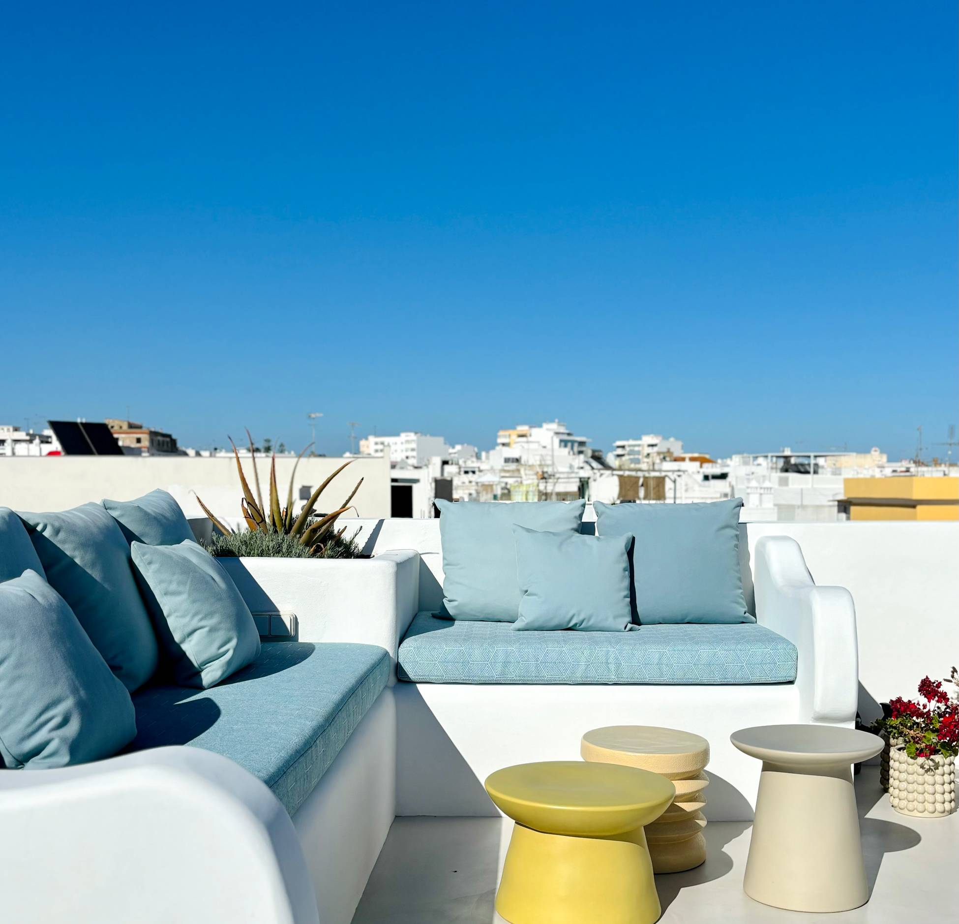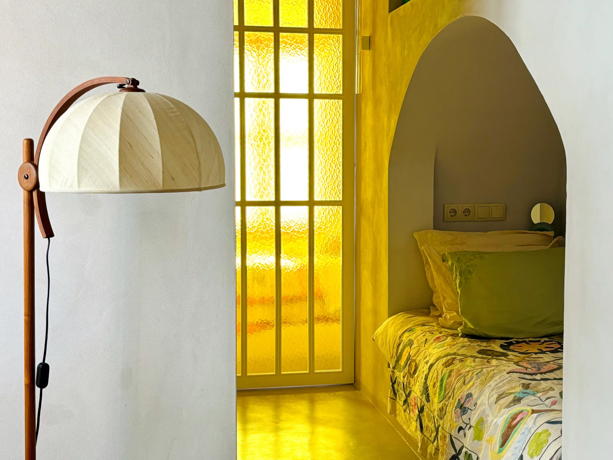 This house is spread over three floors and is designed to comfortably accommodate two or three people. The rounded niches, alcoves and arched openings add character to the rooms. In the living room, a built-in bench invites you to read. The bedrooms extend this atmosphere with colourful linens and a few handcrafted objects. Two terraces complete the house and offer a real luxury for everyday life. In winter, the sun remains present and warms the light-coloured walls. In summer, the first terrace provides protection from the intense heat. Anne-Sophie explains that she chose Olhão for its authentic atmosphere in the magnificent Algarve region.