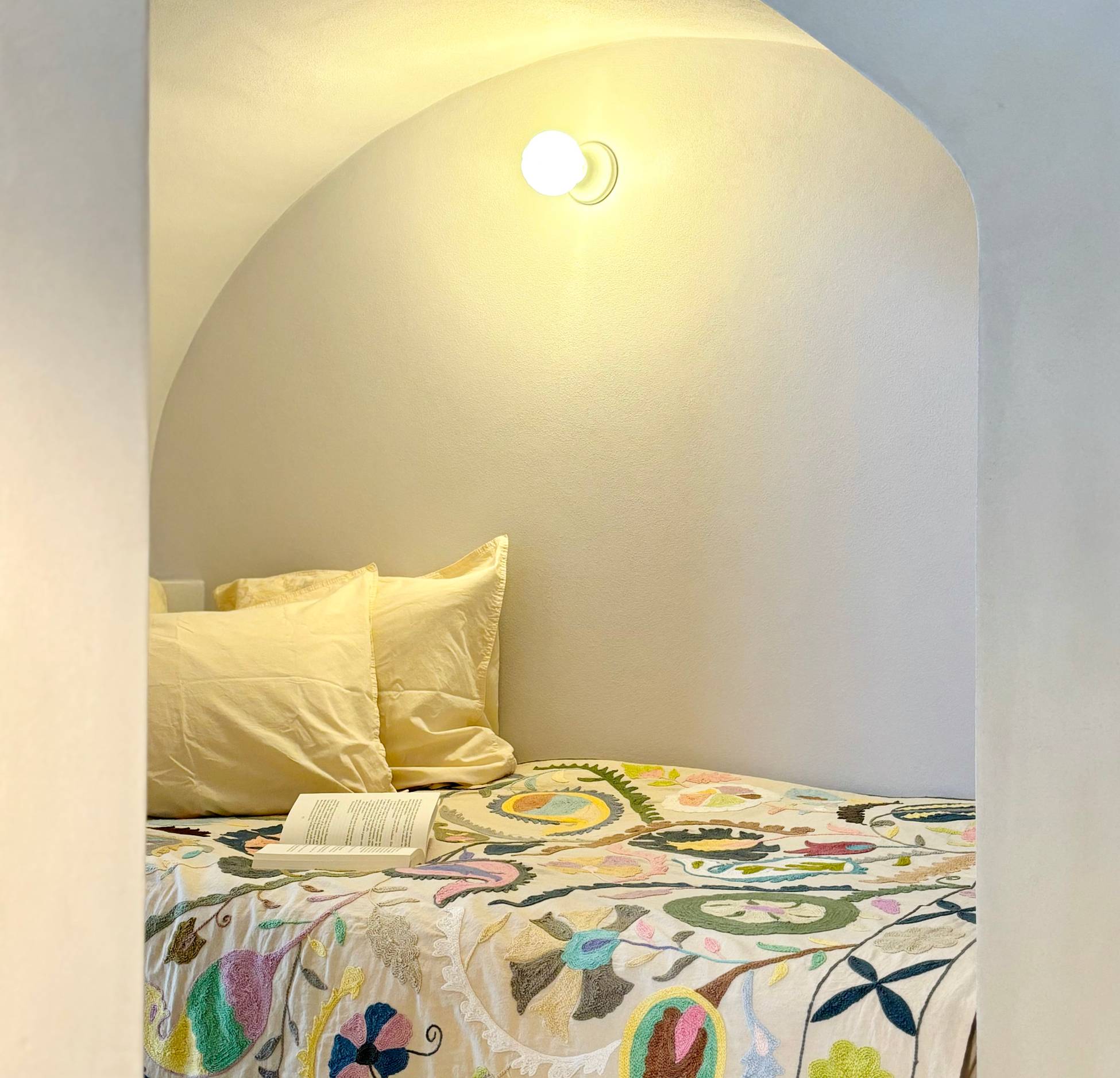 La maison s’organise sur trois étages et est aménagée pour accueille deux ou trois personnes confortablement. Les niches arrondies, les alcôves et les ouvertures cintrées apportent du caractère aux pièces. Dans le salon, une banquette intégrée invite à la lecture. Les chambres prolongent cette ambiance avec du linge coloré et quelques objets artisanaux. Deux terrasses complètent la maison et offrent un vrai luxe au quotidien. L’hiver, le soleil reste présent et réchauffe les murs clairs. L’été, la première terrasse protège des fortes chaleurs. Anne-Sophie explique avoir choisi Olhão pour son atmosphère authentique dans la magnifique région de l’Algarve.
