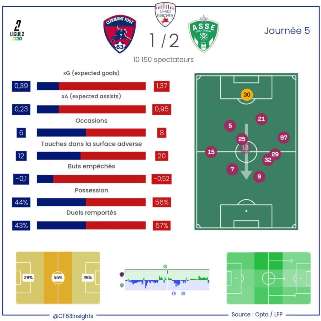 Une juste récompense pour un Clermont, certes dominé, mais aussi joueur, plus vertical et cohérent tactiquement que lors des dernières sorties. Le CF63 mène à la mi-temps, et pas contre n’importe qui : l’ASSE, terreur et désormais leader de Ligue 2.