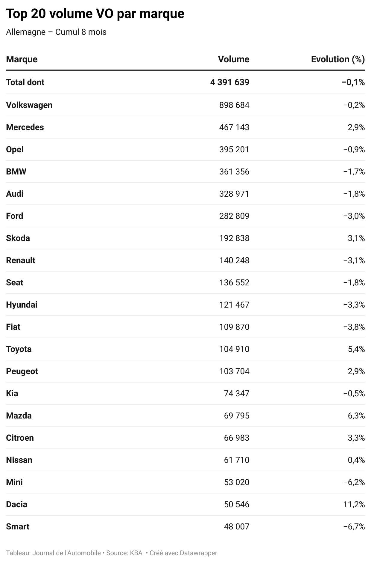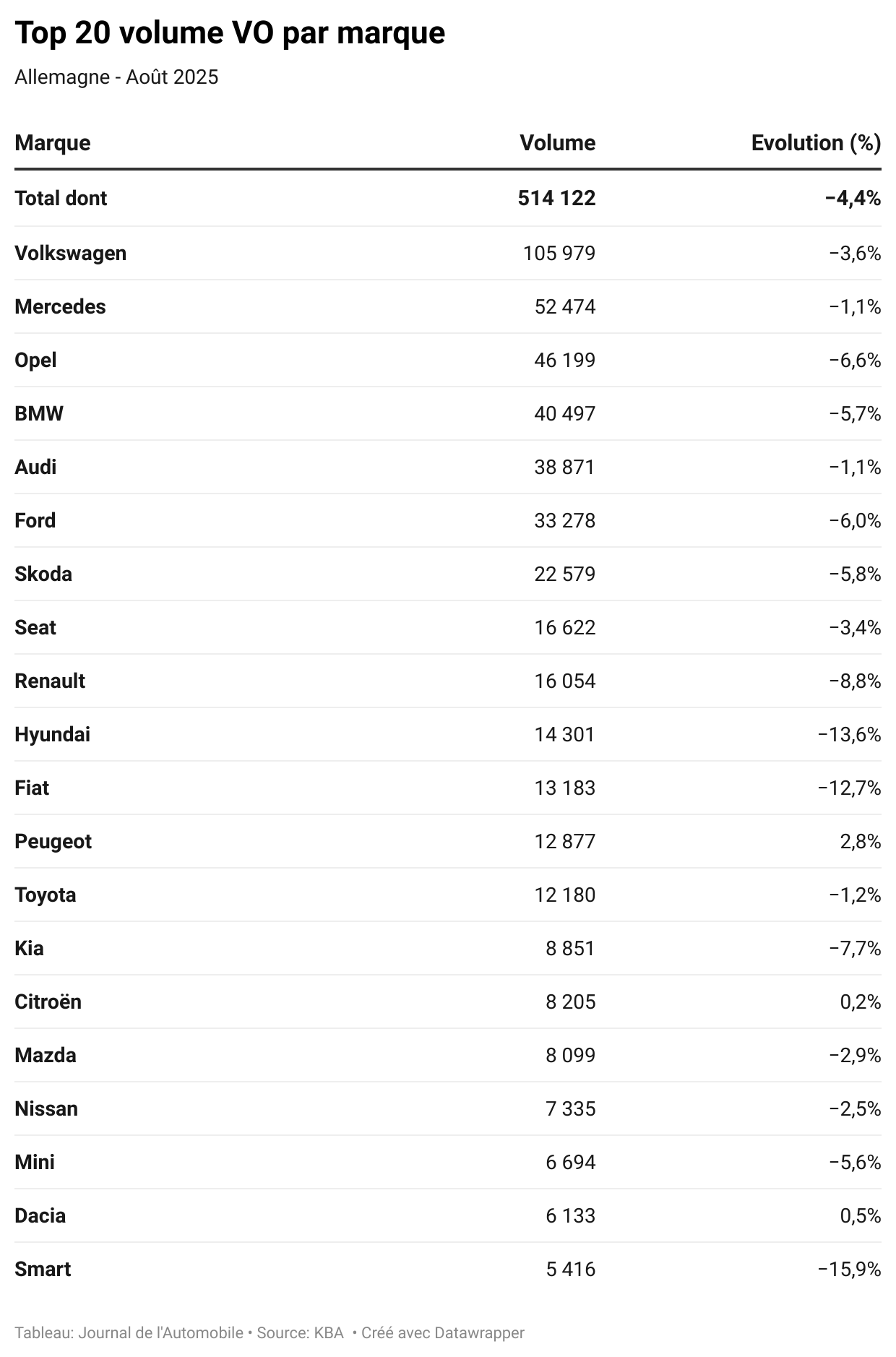 En août, les dix principales marques du marché ont été boudées par les consommateurs. Des gammes comme celles d’Opel et de BMW ont accusé respectivement -6,6 % (à 46 200 unités) et -5,7 % (à 40 500 unités). Chez les importées, Skoda (-5,8 %, sous la barre des 22 600 unités), Renault (-8,8 %, à 16 000 unités) et Hyundai (-13,6 %, à 14 300 unités) ont été particulièrement impactées.