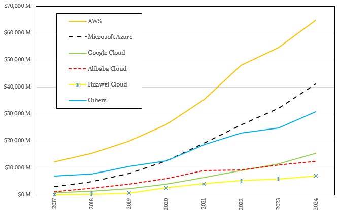 Eight years ago, IBM and Tencent were large enough to make the top five and were for a while in a statistical tie – albeit with pretty modest revenues. Both have dropped below the radar and are not relegated to the Others bin. Alibaba Cloud has grown steadily, but a little more slowly than Google Cloud to be a solid number four, a position it will likely hold and that makes it the largest cloud builder in China.