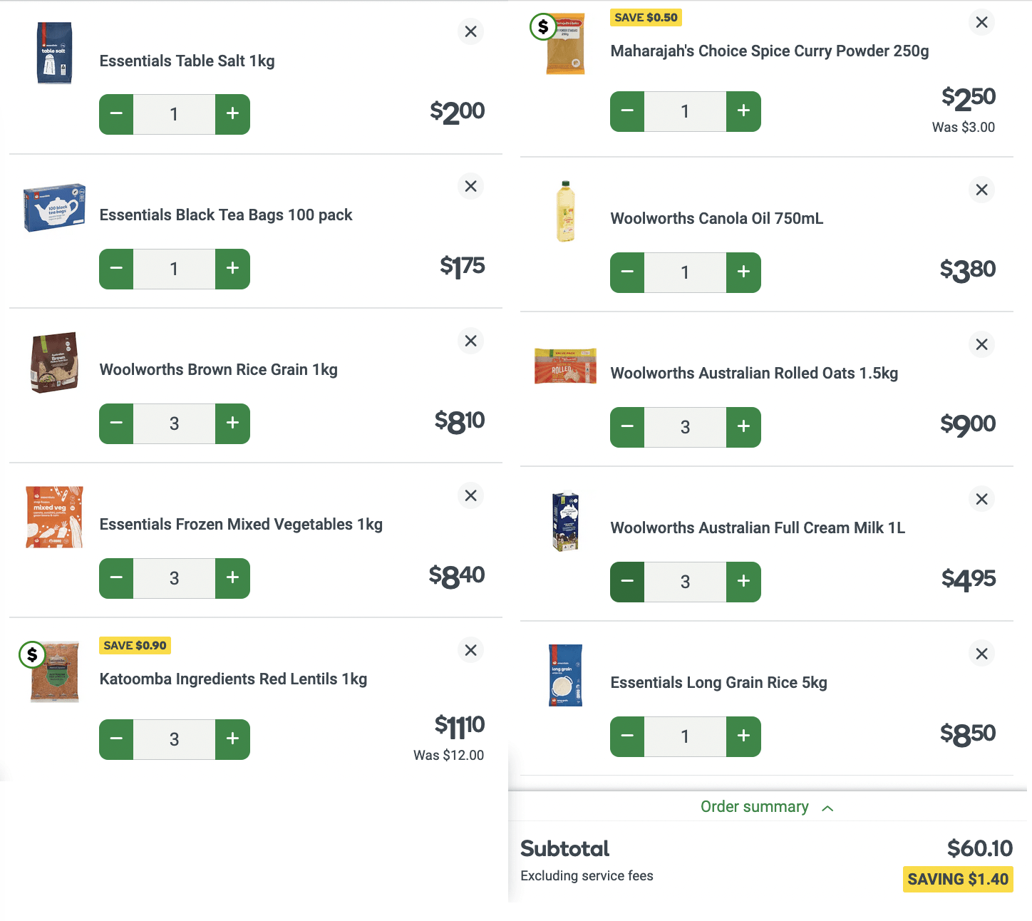 (Note the quantities, we’re getting three one-litre cartons of milk, for example. They cost $1.65 each.)