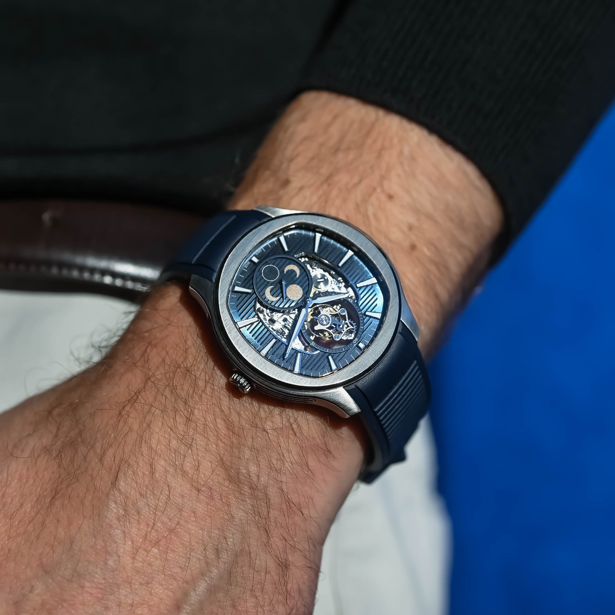 Quick Facts – 44mm x 9.8mm – titanium, brushed & polished – blue PVD gadroons – sapphire crystal front & back – blue dial with horizontal gadroons – applied indices & hands with SLN – moon phase & tourbillon ‘Figure Eight’ – calibre P, in-house – ultra-thin hand-wound – 21,600vph – 40h power reserve – flying tourbillon escapement – astronomical moon phase – blue rubber strap with folding clasp – limited to 88 pieces – EUR 113,000