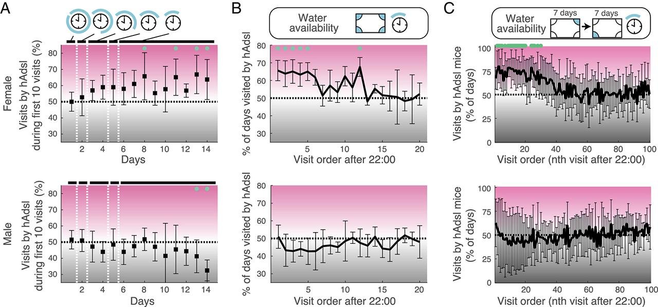 Genetic mutation in key enzyme may explain why humans survived while Neanderthals went extinctFemale mice humanized for ADSL access water quicker after water restriction. (A) The proportion of visits by hAdsl (humanized) mice among the first 10 visits at the four corners on each day as the water was progressively restricted (12, 8, 6, 4, 3 h a day). Upper and Lower panels correspond to female and male cages (5 each). Mean ± SD across cages are shown. Green dots indicate significant differences from shuffled datasets at α = 0.05 level (two-tailed test with Bonferroni correction). A dotted horizontal line at 50% indicates equal access by hAdsl and WT (wild-type) mice. (B) The proportion of days on which hAdsl mice visited the four corners first when water became available (at 22:00). The total number of days was 9 d for each cage. (C) The percentage of days upon which hAdsl mice visited the indicated corners after water became available at 22:00. The total number of days analyzed was 14 d for each cage. Credit: Xiang-Chun Ju et al., PNAS (2025)