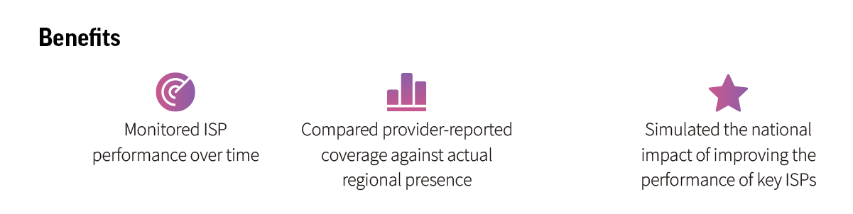 - Prioritizing Impactful Improvements: With limited regulatory resources, ICTA needed a tool to identify which ISPs provide poor services, thus, hindering achieving the country’s internet speed objectives. A scalable, simulation-based approach was essential to target high-impact providers rather than applying blanket requirements.