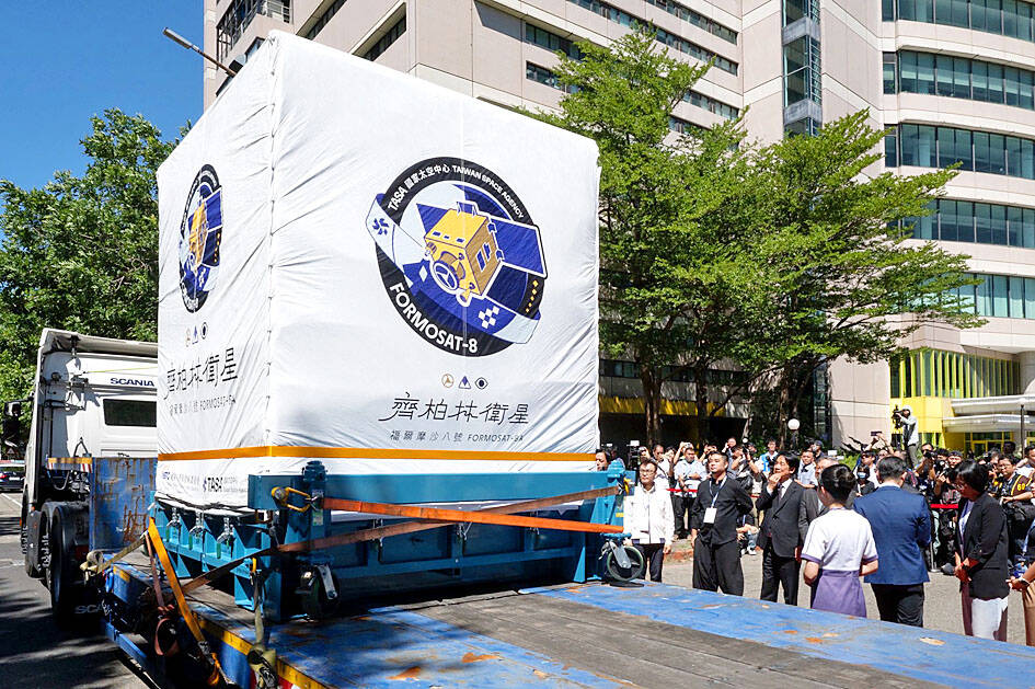 The first satellite of Formosat-8, Taiwan’s first domestically developed optical remote sensing satellite constellation, left the Taiwan Space Agency (TASA) headquarters in Hsinchu yesterday ahead of its launch in the US next month.