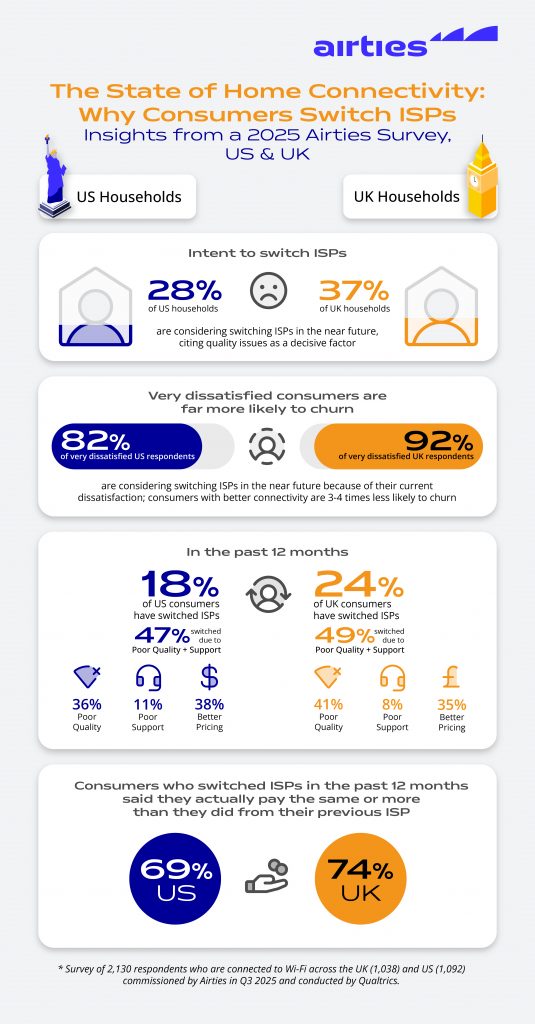 “This survey research underscores a clear message for ISPs: service quality continues to drive churn,” said Metin Taskin, CEO and founder of Airties. “Nearly one-third of households in the US and UK are actively considering switching providers due to poor quality of experience. It’s a multi-billion-dollar problem for broadband service providers globally. With such high churn rates, ISPs are forced to spend incredible time and money chasing new customers every year – just to break even for the customers they lost. Any incremental improvement in churn can unlock growth and massively improve the bottom line. This survey is further evidence of the imperative for ISPs to focus on customer retention by improving quality. Consumers want fast, consistent, and quality home Wi-Fi connectivity – and the data also shows they are willing to pay more for it.”