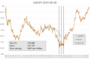 This translated into a series of lower-than-average savings from using the longer 20-minute Siren FX methodology compared to the five-minute WM version. That said, only NZD/USD, at $86 per million was a new low for the year, it was the lowest since July 2024. Only USD/JPY and USD/CHF were above the 2024 average saving, with EUR/USD at just $17 per million – the second lowest in the last 10 months.