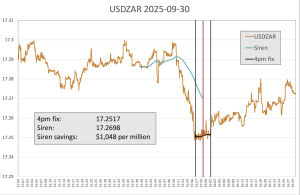 That said, again, flows appear to have been light, and the hedging ahead of the Fix largely appears to have taken place in the five-10 minutes ahead of the WM window opening. It was also the third highest potential saving from the Siren window this year.