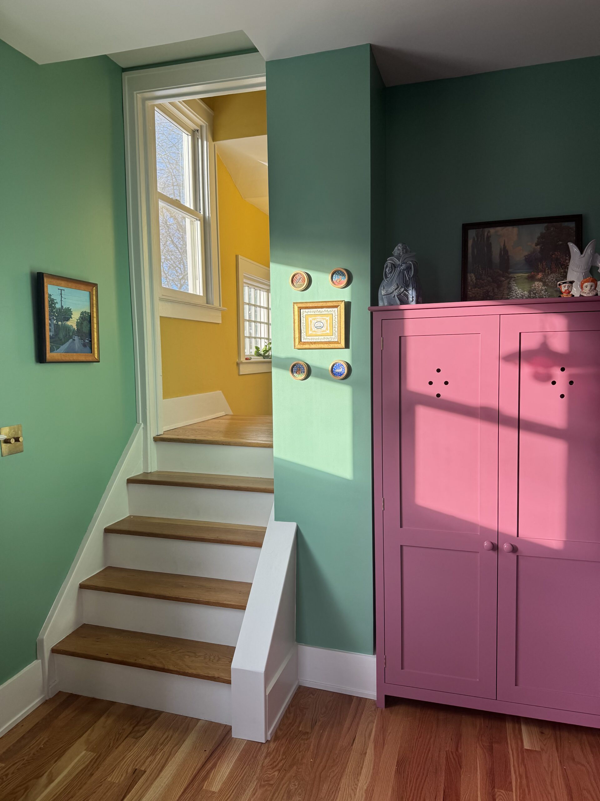 “I live in one of the cloudiest cities in the U.S. and knew that color would brighten our kitchen [both photos above]. I decided to paint the walls Arsenic green, the cabinets Bond Street Blue, our freestanding pantry Rangwali pink, and the stairs in a shade of yellow inspired by the Dunraven Arms hotel in Adare, Ireland.” — Averil, Grand Rapids, Michigan