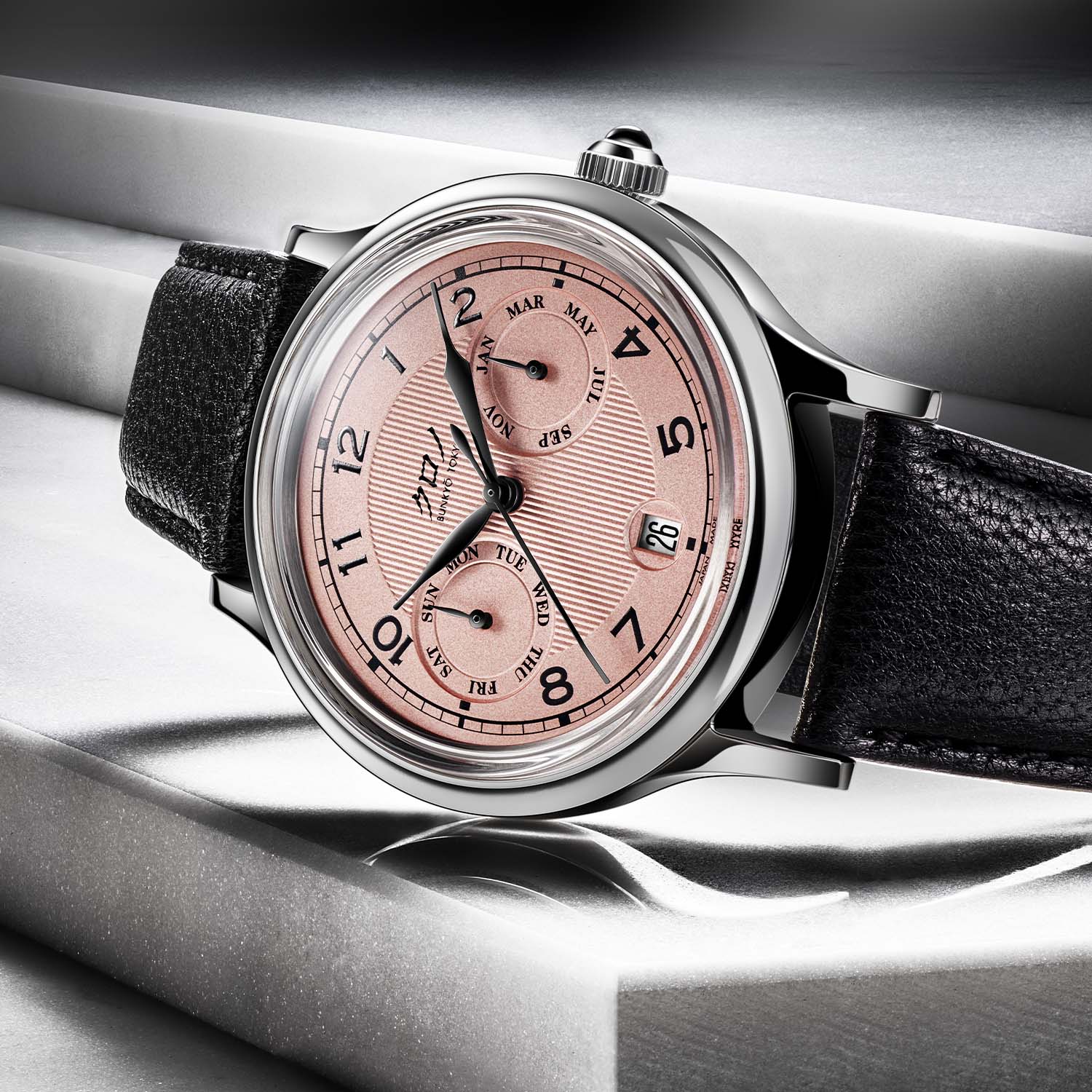 Under the dial, with its redesigned date window, is a tried-and-tested movement sourced from Japanese maker Miyota. This automatic calibre 9122 runs at a frequency of 4Hz and stores about 40 hours of power reserve. The Grand Jubilee Calendar is secured to the wrist by a 20/16mm black calfskin leather strap, closed by a classic steel pin buckle.