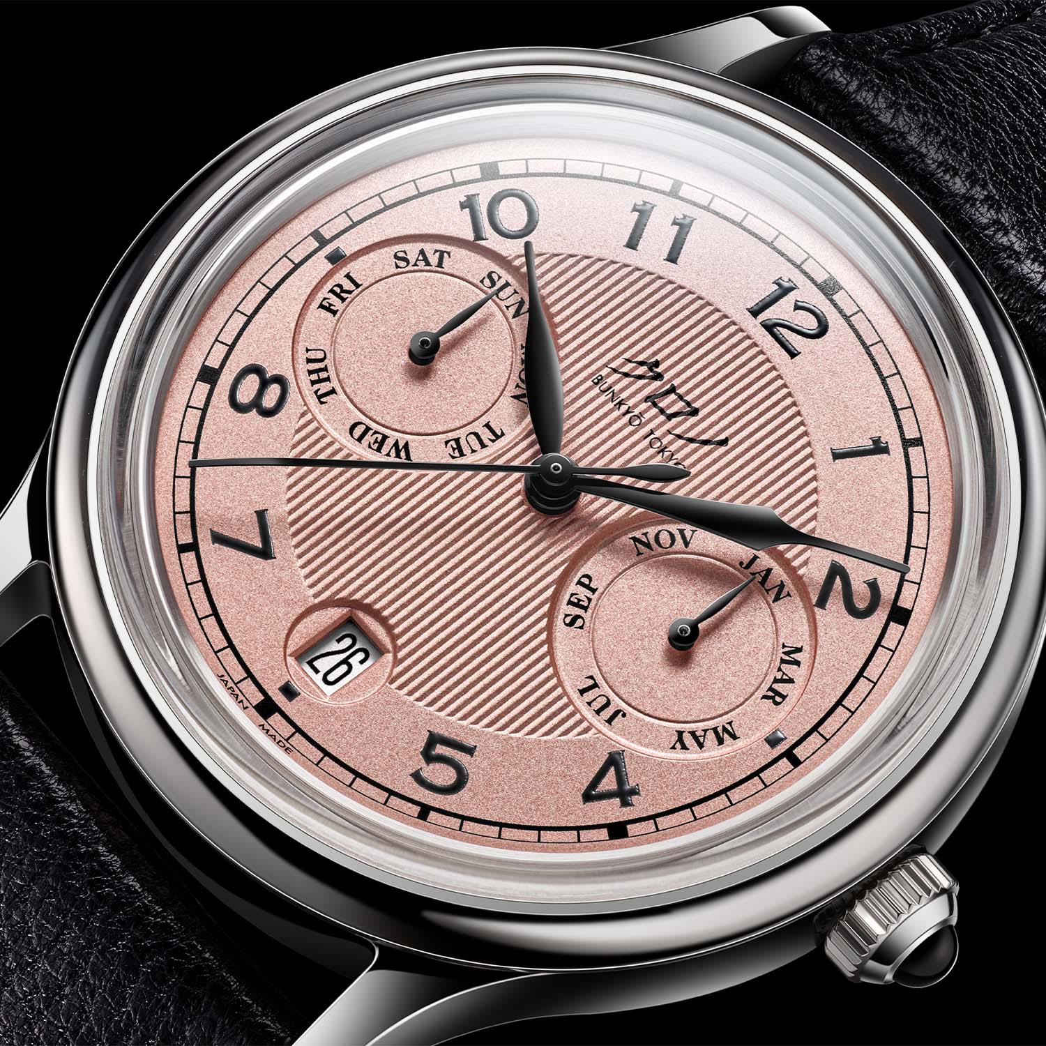 Moving to the dial, more details create a connection between the high-end creations of Asaoka and this accessible take on his design cues, starting with the stamped vertical strokes in the middle of the dial, an element that is also found in his tourbillon models. The dial is presented in a matte, lightly grained salmon tone, a classic combination that always works nicely. The triple calendar watch has a date window at 6 o’clock and two sunken sub-dials for the month and weekday indications.